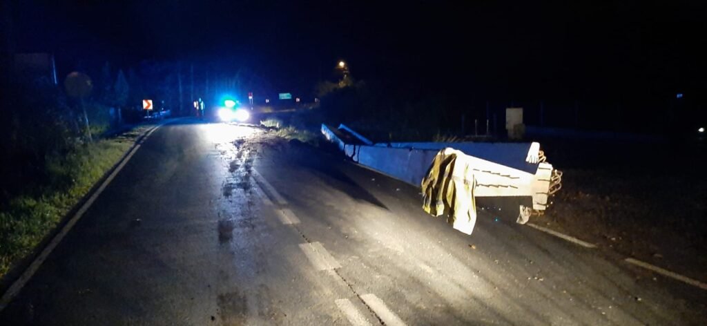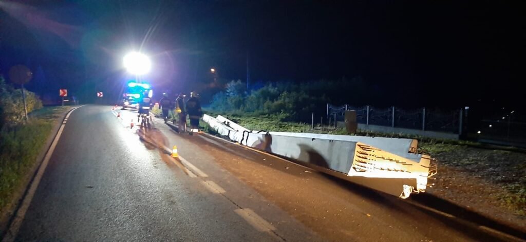 Z niecodzienną sytuacją miały do czynienia dzisiejszej nocy służby ratunkowe straży pożarnej oraz policji. Około godziny 22:00 drogą wojewódzką 975 w kierunku południowym przemieszczał się ponadgabarytowy konwój. Kierowca samochodu ciężarowego przewoził kilkunastometrowe betonowe przęsło mostu, które na krętej drodze spadło z naczepy i częściowo blokował jeden pas drogi wojewódzkiej.